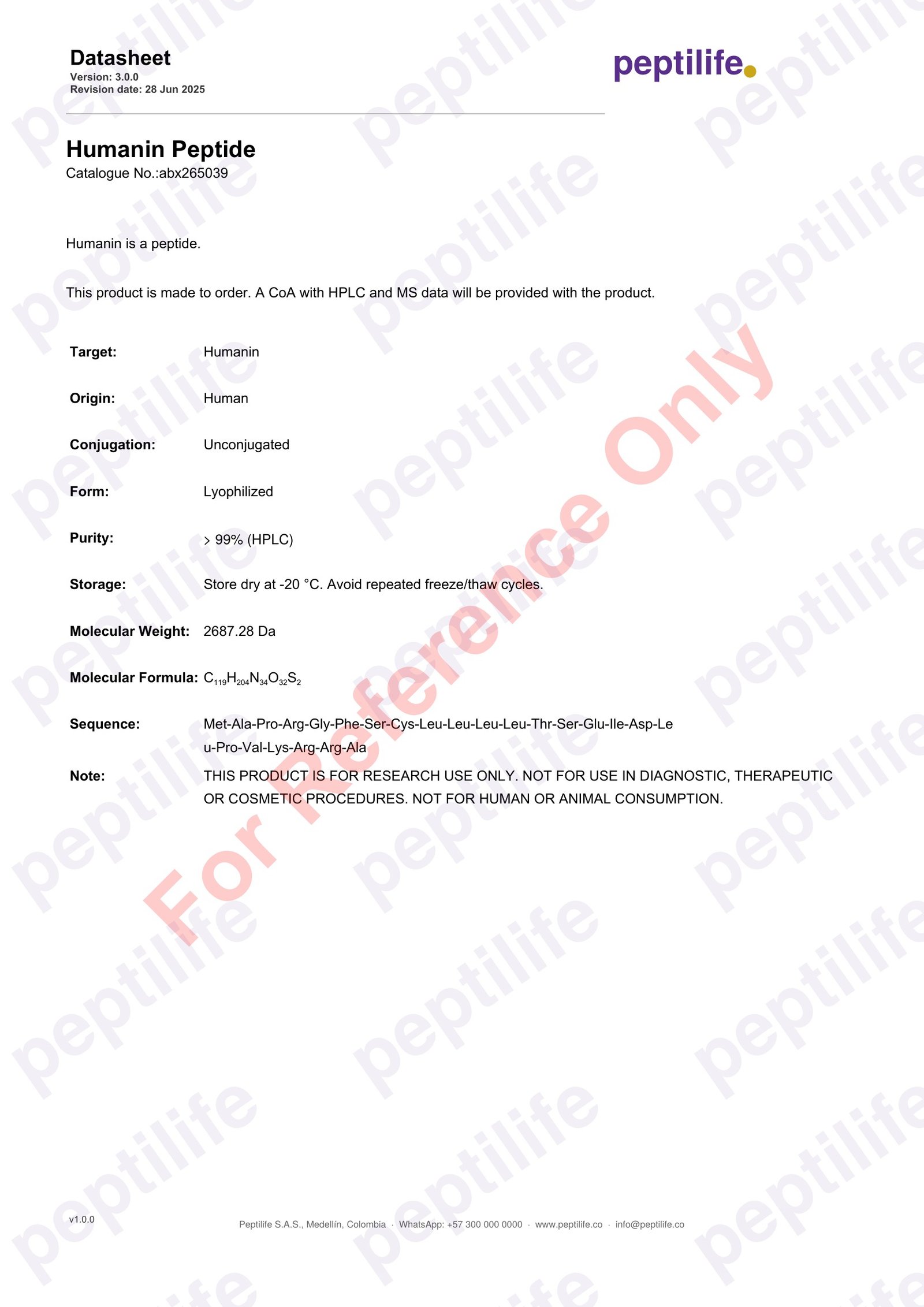 Humanin es un micropéptido de origen mitocondrial compuesto por 24 aminoácidos, identificado como un factor clave en la protección celular y la supervivencia. Actúa a través de múltiples vías de señalización, incluyendo la activación del receptor FPRL1 y la modulación de la vía STAT3, proporcionando efectos citoprotectores, antiapoptóticos y antiinflamatorios a nivel celular.